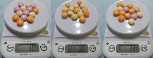 ...혹시나 해서 저울에 올려봤다. 오, 생각보다 정확하다. 스무번 측정한 결과, 최저 38g에서 최대 40g까지 측정됐다. 어쨌든 37.5g보다 적은 경우는 한 묶음도 없었다. 멘토스 만쉐이.