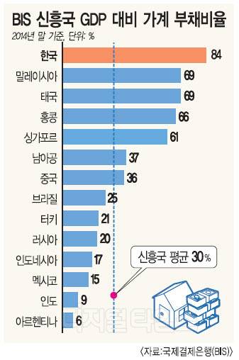 15일 국제결제은행(BIS)이 선진 12개국과 신흥 14개국을 대상으로 가계와 정부, 기업의 국내총생산(GDP) 대비 부채비율을 조사한 결과에 따르면 우선 한국의 GDP 대비 가계부채 비율은 지난해 말 기준 84%로 신흥국 평균(30%)의 2.5배에 달했다.