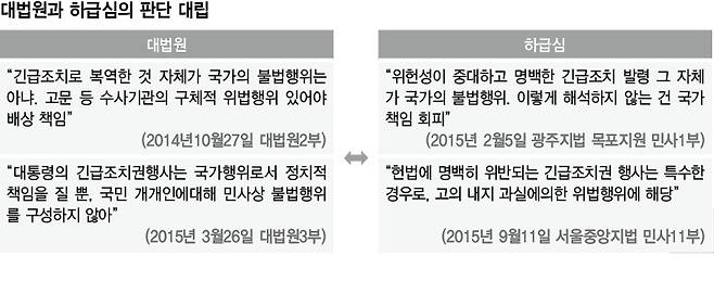한달 뒤 대법원은 더 노골적으로 긴급조치를 '옹호'하는 판결을 내놨다. 대법원 3부(주심 권순일 대법관)는 "긴급조치 9호가 사후적으로 위헌·무효가 선언됐더라도 유신헌법에 근거한 대통령의 긴급조치권 행사는 고도의 정치성을 띤 국가행위다. 대통령은 긴급조치권 행사에 정치적 책임을 질 뿐 법적 의무를 지는 것은 아니다"라고 밝혔다.