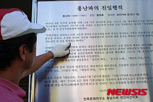 민족문제연구소 충남지부 천안아산지회는 20일 오전 천안시 동남구 목천면 독립기념관 진입로 왼쪽 숲에 꾸며진 광복의 동산에 홍난파의 잘못을 열거한 '단죄문'을 기념비와 나란히 설치해 제막식을 갖는다.