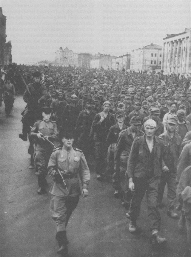 1943년 초여름에 모스크바 거리를 걸어 전쟁포로수용소로 가는 5만2,000명의 독일군 포로들. 소련은 독일군 불패 신화를 깨고 자국민의 사기을 드높이려 독일군 포로를 모스크바 시내를 가로질러 이송했다