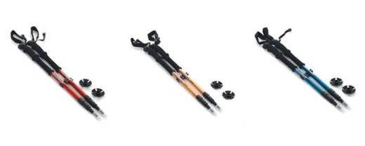 | 몽벨의 듀랄루민 3단 스틱 '메이저 3단'. 레드, 옐로우, 틸블루 색상(왼쪽부터) /사진제공=LS네트웍스 |