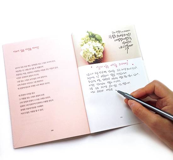 ① 책의 왼쪽엔 글의 전문이, 오른쪽엔 독자가 필사를 할 수 있는 감성 여백이 편지지처럼 디자인돼 마치 나를 위해 혹은 누군가에게 좋은 구절을 선물하는 듯한 기분을 느낄 수 있다.