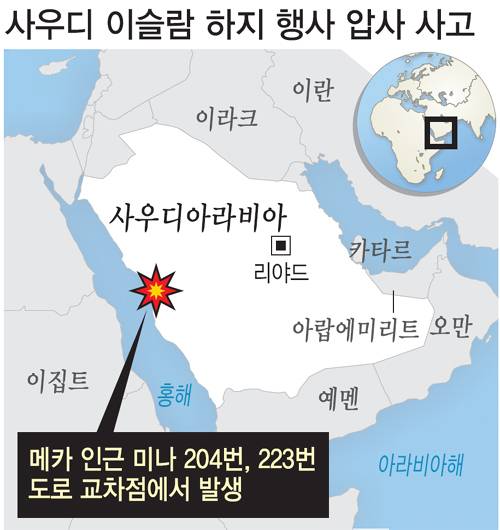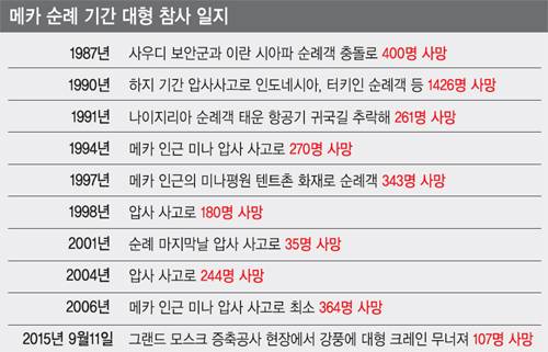 사우디의 이슬람 성지에서는 좁은 공간에 인파가 한꺼번에 몰리면서 대형 압사사고가 종종 발생했다. 2004년엔 순례객 사이에 충돌이 벌어져 244명이 숨지는 폭력사태가 벌어졌다. 1990년에도 순례객 1426명의 목숨을 앗아간 최악의 압사사건이 발생했다.