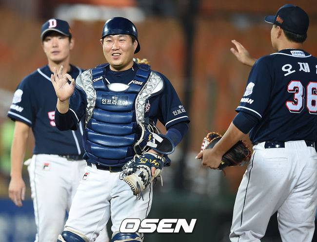 경기종료 후 두산 양의지가 롯데 선수들에게 향해 미안함을 전달하고 있다./ soul1014@osen.co.kr