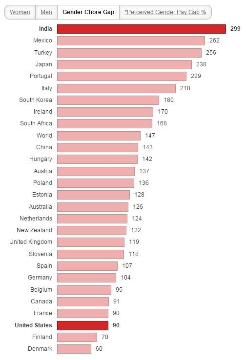 가사 업무를 가장 오래하는 여성은 터키인으로 375분이었다. 멕시코(374분), 인도(351분), 포르투갈(326분), 이탈리아(314분) 순으로 많았다.
