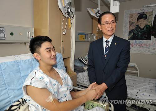 (서울=연합뉴스) 대한민국재향군인회 조남풍 회장이 25일 추석 명절을 맞아 경기도 성남시 분당 서울대 병원을 방문, 북한 지뢰도발로 인해 부상을 당한 하재헌 하사를 위문하고 있다. 2015.9.25 << 향군 제공 >>