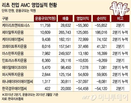 전업 AMC의 올 2분기 실적을 살펴보면 10개사중 4개사가 지난해에 이어 올해도 적자를 면치 못했다. 자산 운용 규모가 가장 큰 케이리츠앤파트너스는 5억5852만원의 순손실을 기록했고 한국경우에이엠씨(-5억4120만원)와 인트러스투자운용(-9269만원)도 적자가 이어졌다.
