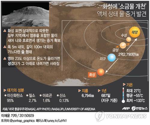 (샌프란시스코=연합뉴스) 임화섭 특파원 = 화성에 액체 상태의 물이 '소금물 개천' 형태로 지금도 흐르고 있음을 보여 주는 강력한 증거가 발표됐다.