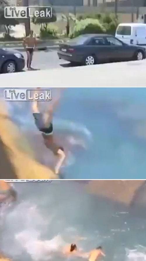 영상에는 한 청년이 난간이 있는 해변 절벽 아래로 다이빙을 시도하려 한다. 한 차례 망설임 끝에 청년이 난간 위로 점프하며 절벽 아래로 다이빙하는 순간, 그의 머리가 절벽에 부딪히며 바닷물 속으로 빠진다. 수면 위에 정신을 잃은 그를 구하기 위해 친구들이 바닷물 속으로 뛰어든다. 친구들이 그를 바위로 들어 올린 후, 그의 부상 정도를 살핀다.