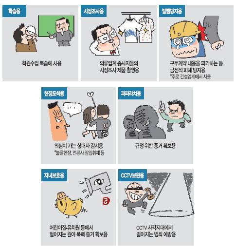 파파라치에겐 필수품이다. 학원 식당 상점 등에 들어가 규정 위반 증거를 확보할 때 사용된다. 학원 불법영업부터 건강기능식품 무허가 판매, 재료 원산지 미표시, 일회용 비닐봉투 무상제공까지 찍을 건 많다.