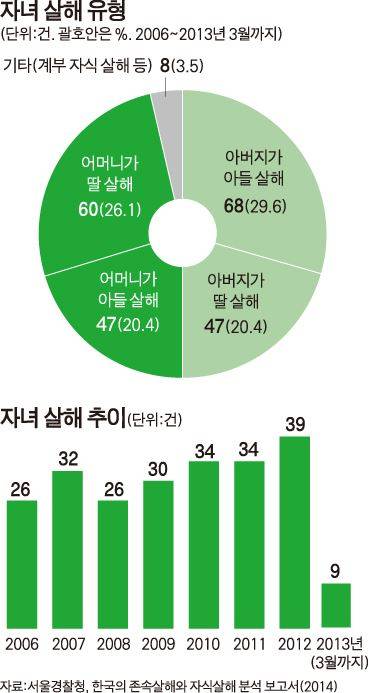 서울경찰청이 지난해 발표한 ‘한국의 존속살해와 자식살해 분석’ 보고서에 따르면 2006년 1월부터 2013년 3월까지 모두 230건의 자식 살해가 발생했다. 연간 30~40건에 해당하는 수치다. 특히 피의자의 46%가 어머니인 여성으로 나타나 존속살해에서 여성 피의자가 차지하는 비율(12.9%)보다 월등히 높은 것으로 나타났다. 2013년 절도ㆍ폭력 등 전체 범죄의 피의자 가운데 82%가 남성이고 여성은 18%에 불과한 것과 비교해도 차이가 확연하다. 장미혜 한국여성정책연구원 여성권익센터장은 “모성애는 여성들에게는 어떤 어려움에서도 마지막까지 남는 본능”이라며 “10개월 동안 기다려 낳은 아이를 살해하게 하는 사회적 원인이 존재한다”고 말했다.