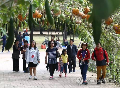 (서울=연합뉴스) 김도훈 기자 = 4일 서울 마포구 월드컵공원 내 평화의 공원에서 열린 '2015 서울정원박람회'를 찾은 시민들이 오이·박 터널을 지나고 있다. 2015.10.4