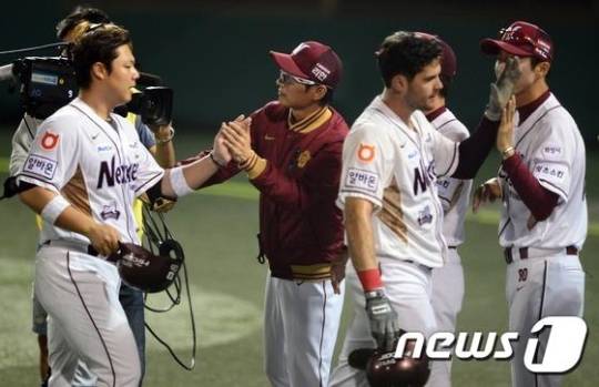 | 경기 후 넥센 염경엽 감독(왼쪽에서 두 번쨰)이 선수들을 격려하고 있다. /사진=뉴스1 |