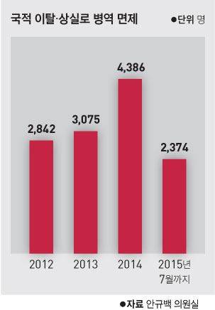 공직자 자녀들이 이처럼 국적 포기를 주도하는 탓에 ‘국적 이탈 및 상실’로 병역 면제를 받는 사람들도 급증세다. 안규백 새정치민주연합 의원에 따르면 2012년 2,842명에서 작년 4,386명으로 증가했고 올해도 7월까지 2,374명이 이 같은 이유로 입대하지 않았다.