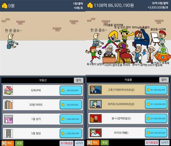 한 번 터치할 때마다, 시간이 흐를 때마다 기하급수적으로 쌓이는 돈은 기분이 좋아지게 만든다. 현실에서 느끼기 힘들 만큼의 부를 대리만족한다는 생각에 계속 화면을 터치하게 된다. 단순하지만 참신하다. 요새 비슷비슷한 모바일 게임들 속에서 정말 참신한 게임을 원했다면 이보다 제격인 게임을 찾기는 힘들 것이다.