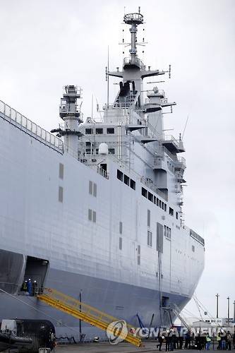 epa04976381 Exterior view of a former Russian Mistral warships anchored at the shipyard of Saint Nazaire, France, 13 October 2015. Egypt and France on 10 October 2015 signed a deal to supply Cairo with two assault ships as the Middle East country is struggling with a militant insurgency at home and in the region. Under the deal, France is to sell two Mistral-class amphibious assault ships to Egypt after their sale to Russia was blocked in 2014 in protest of Moscow's role in the Ukrainian conflict. EPA/YOAN VALAT