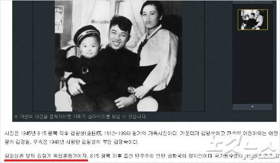 하나의 사진은 1945년 8월15일 광복 직후 김일성 일가의 가족사진이다. 이에 대해 "가운데가 김일성이고 좌측의 어린아이는 어린시절의 김정일, 우측은 1949년 사망한 김일성의 부인 김정수이다"라는 설명이 있다.