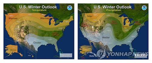 This combo of images provided by NOAA (National Oceanic Atmospheric Administration), shows the three-month temperature, left, and precipitation forecasts for the U.S. Forecasters say this winter El Nino is about to leave a big wet but not necessarily snowy footprint on much of the United States, including parched California. NOAA on Thursday issued a winter forecast, heavily influenced by one of the strongest El Ninos on record. (NOAA via AP)