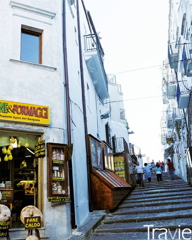 가벼운 상념에서 깨어나면 차는 꼬불꼬불 가파른 언덕을 쉼 없이 올라간다. 굳이 이 험한 비탈길을 오르는 가장 큰 이유는 성 미카엘San Michaele 성당 때문이다. 성 미카엘 성당은 흔히 생각하는 유럽의 성당과는 여러모로 다르다. 웅장한 규모로 기를 죽이지도 않고 화려한 장식으로 시선을 분산시키지도 않는다. 가르가노산에 기대 세워진 성당 예배당은 동굴을 이용한 독특한 구조가 종교에 상관없이 보는 이를 숙연하게 만든다. 그리스도교 일곱 수호천사 중 하나인 성 미카엘이 3차례 출현한 곳으로도 유명해 순례자의 발길이 끊이지 않는다. 성당 안에는 역대 교황의 방문 사진과 성당의 역사가 소박하게 전시돼 있다. 성당에서 나와 언덕을 오르면 노르만노 성이 든든히 버티고 있다. 몬테 산탄젤로는 독특한 수공예품과 빵으로 유명한데 성당과 성을 오가는 언덕길에 상점이 많다.
