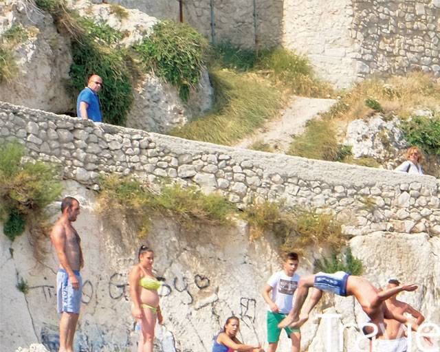 주말 오후 해안가에 모여 다이빙을 하는 젊은이들