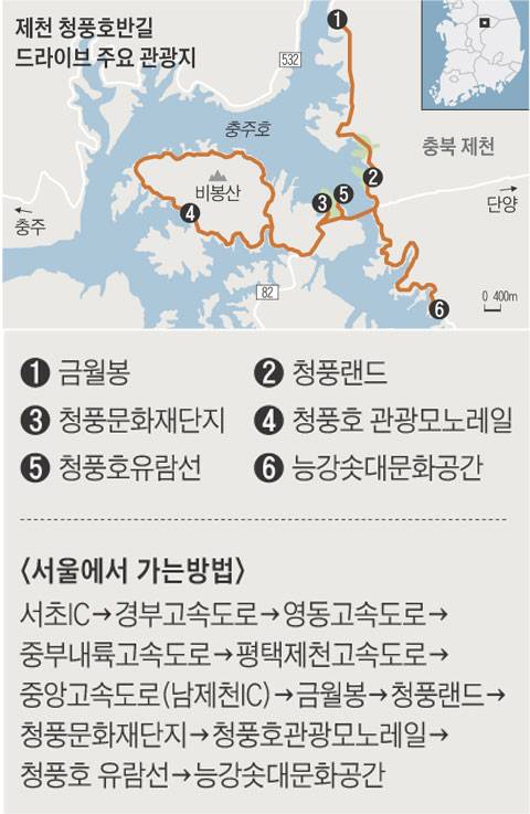 완연한 가을로 접어들면서 드라이브에 나서는 사람이 늘고 있다. 산만 가자니 물이 보고 싶고, 드라이브만 하자니 심심하다면'제천 청풍호반길 드라이브'를 추천한다. '제천 청풍호반길 드라이브'는 서울에서 가는데만 180여㎞ 거리로 금월봉, 청풍랜드, 청풍문화재단지, 청풍호 관광모노레일·유람선, 능강솟대문화공간으로 이어진다.