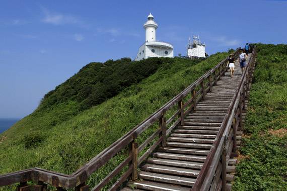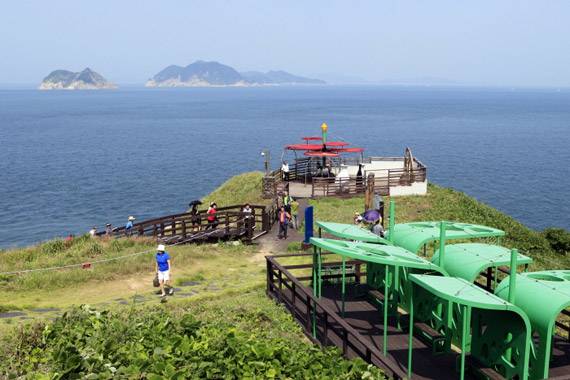 선착장에 내려서자 등명기 모양 쉼터 ‘환영의 빛’이 등대섬답게 여행자를 맞아준다. 산책로 초반은 계단을 따라 오른다. 첫 모퉁이를 돌 때 옹기 쉼터가 나온다. 섬의 중간 높이로 선착장 풍경을 품는다. 옹기는 이 섬에 옹도라는 이름이 붙은 기원이다. 섬이 옹기를 옆으로 뉘어놓은 것처럼 생겼다고 해서 옹도다. 섬 곳곳에 있는 옹기 형상 조형물도 같은 의미다.