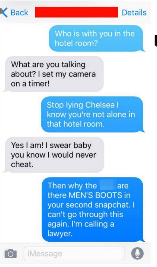 남편 아내에게 “호텔에 누구와 있느냐”고 물었고, 아내는 “무슨 말이야? 타이머를 맞춰 촬영했을 뿐”이라고 답했다. 남편은 화를 가라앉히고 “호텔에 혼자 있는 것이 아니란 걸 알고 있다”며 “남자 부츠가 왜 사진에 있는지 설명하라”고 말했다. 그러면서 남편은 “변호사에게 연락하겠다”고 덧붙였다.
