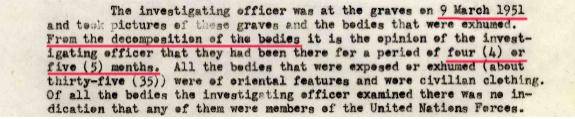 | ▲ "조사관은 1951년 3월 9일 무덤과 노출된 사진을 찍었다. 시신들의 부패 정도로 보아 조사관은 시신들이 4~5개월 동안 그곳에 있었다고 주장하였다. (약 35구의) 노출된 시신들은 동양인으로서 민간인 옷을 입고 있었다. 조사관이 검사한 시신들은 모두 유엔군의 표식은 없었다." |