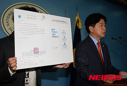 【서울=뉴시스】조수정 기자 = 노웅래 새정치민주연합 의원이 23일 오후 서울 여의도 국회 정론관에서 지방자치단체에게 보내는 행정자치부의 '국정 역사교과서' 홍보 관련 공문을 들어보이며 공문의 내용을 설명하고 있다.