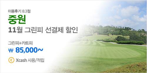 11월 30일까지 그린피와 카트피가 포함된 금액이 주중 4인 1팀 이용 기준으로 18홀은 8만5천원부터, 27홀은 12만5천원부터 예약이 가능하다. 또한 골프장 예약 시 XGOLF 홈페이지에서 현금처럼 사용할 수 있는 Xcash지급 혜택이 주어진다. 중원G.C는 충주시 산척면에 위치한 대중제 27홀 골프장으로 산 아래의 전경을 한눈에 두고 시원함을 느낄 수 있는 다양한 코스가 구성되어 있다.