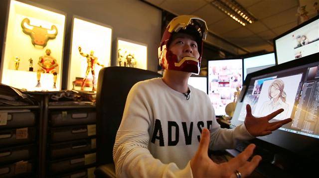 만화가들의 작업실이 모여 있는 경기도 부천 한국만화영상진흥원 비즈니스센터는 겉으로 보기엔 평범한 사무실 건물과 다를 게 없다. 그런데 그 중 멀리서부터 번쩍이는 한 작업실이 있다. 문틀을 두른 전구들과 문에 붙은 아이언맨 가면을 장식한 조명은 네온사인처럼 번쩍거린다. 열린 문틈 사이로 보이는 작업실엔 크고 작은 피규어와 장식품들이 빼곡하다. 얼핏 장난감 박물관처럼 보이는 이곳은 웹툰 <몸에 좋은 남자>를 그리는 박형준 작가(36)의 작업실이다.