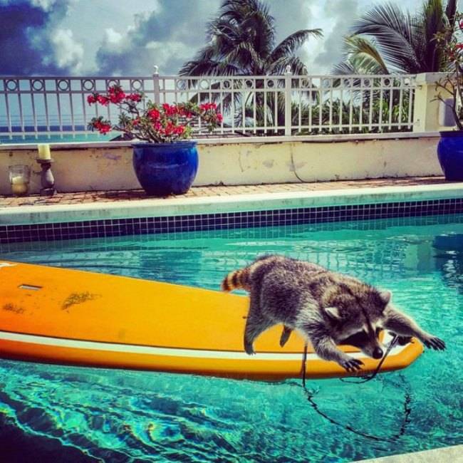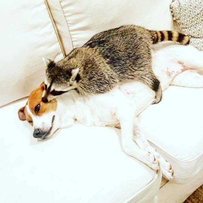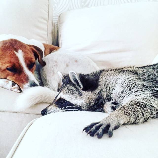 두 마리 개와 함께 자란 라쿤 펌킨의 일상 사진을 보면 라쿤은 스스로를 개로 착각하고 있는 게 아닐까 의심이 들 정도. 어미를 잃고 한쪽 다리가 부러진 채로 지금의 주인에게 발견됐다. 바하마에는 별도로 라쿤의 구조센터가 없고 미국처럼 라쿤을 광견병 전염매개체로 여기지 않기 때문에 펌킨을 직접 구조해 키우는 게 가능했다고 한다. 단 주인은 라쿤이 야생동물이지 애완동물이 아니라고 강조.