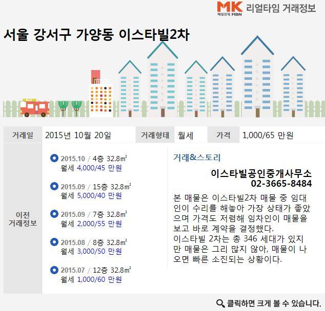 강서구 이스타빌2차 오피스텔 전용면적 32.79㎡(약 9.9평)가 월세로 거래됐다. 이 지역 이스타빌공인중개사무소는 12층 매물을 지난 10월 20일 보증금 1,000만원, 월세 65만원에 계약했다고 밝혔다.