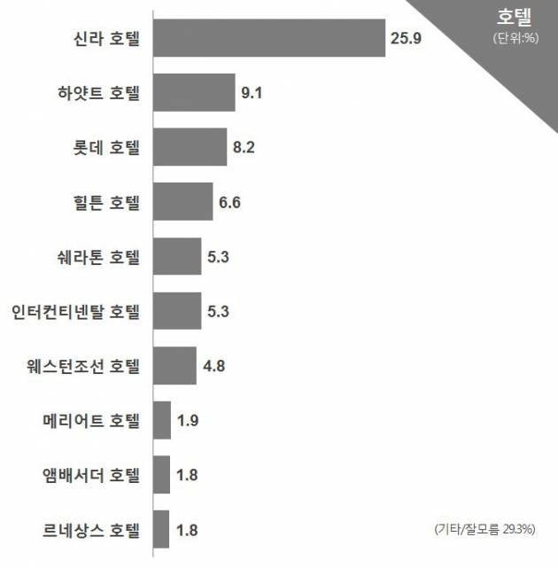 힐튼호텔(6.6%)이 4위에 이름을 올렸다. 쉐라톤호텔(5.3%)과 인터컨티넨탈호텔(5.3%)이 동점으로 5위를 차지했다.