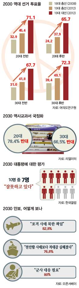 이렇듯 2030세대가 날 선 정책 비판을 내놓고 있는 현 상황에서 안보에 대한 2030세대의 생각은 주목할 만하다. 지난 8월 북한의 포격 도발 사태 이후 매일경제와 리서치 전문 회사 '오픈서베이'가 조사한 바에 따르면, 지금까지 진보적인 모습을 보여왔던 2030세대의 달라진 안보관이 눈에 띈다. 한반도 긴장 사태의 책임 소재에 대해서도 "북한 책임이 크다"는 응답이 82.8%를 차지했으며, 76%가 "천안함 피격 때보다 북한 정권에 대한 적대감이 심해졌다"고 답했다. 또 80%가 "군사 대응 필요성이 커졌다"고 응답했다. 인터넷상에 "언제든 국가의 부름에 응하겠다"는 댓글이 줄을 이었고, 자신의 SNS에 예비군복 착용 모습을 찍어 올리기도 했다.