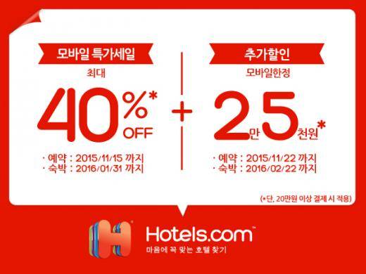 아울러, 호텔스닷컴은 오는 11월 22일까지 모바일 어플리케이션을 통해 20만원 이상 결제하는 고객에게 선착순으로 2만5000원 추가 할인 혜택도 제공한다. 호텔스닷컴 모바일 어플리케이션을 실행하여 원하는 호텔 상품을 선택하고 결제창에 할인코드(MOBKR)를 입력하면 할인 혜택이 자동으로 적용되며, 숙박기간은 내년 2월 22일까지다.