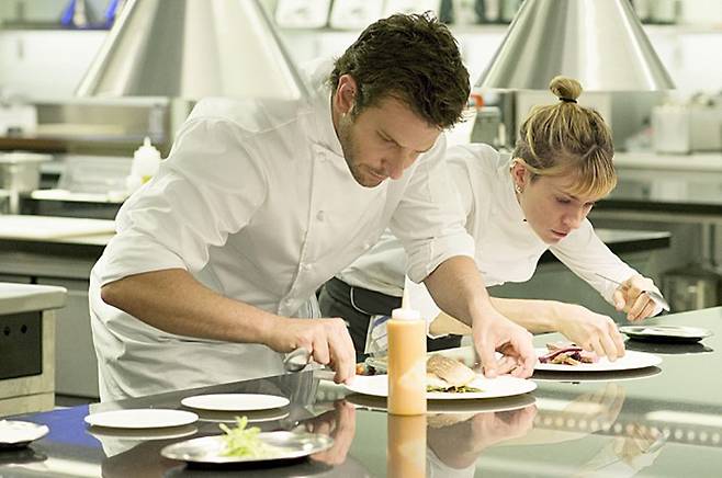 | ▲ 더 셰프 아담 존스(브래들리 쿠퍼 분)를 따라 플레이팅에 집중하는 스위니(시에나 밀러 분). 전작 <아메리칸 스나이퍼>에서 부부로 출연했던 둘은 이번엔 연인으로 발전하는 주방장과 보조요리사를 맡아 연기했다. |