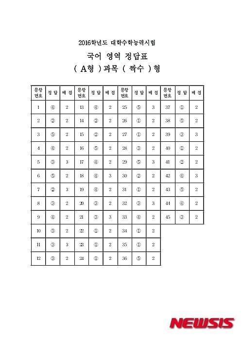 【서울=뉴시스】임종명 기자 = 2016학년도 대학수학능력시험 국어A형 짝수형 답안. (답안 = 한국교육과정평가원 제공) 2015.11.12.