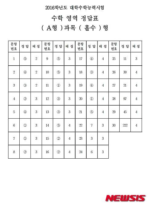 【서울=뉴시스】임종명 기자 = 2016학년도 대학수학능력시험 수학A형 홀수형 답안. (답안 = 한국교육과정평가원 제공) 2015.11.12.
