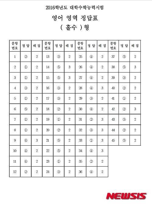 【서울=뉴시스】임종명 기자 = 2016학년도 대학수학능력시험 영어 홀수형 답안. (답안 = 한국교육과정평가원 제공) 2015.11.12.