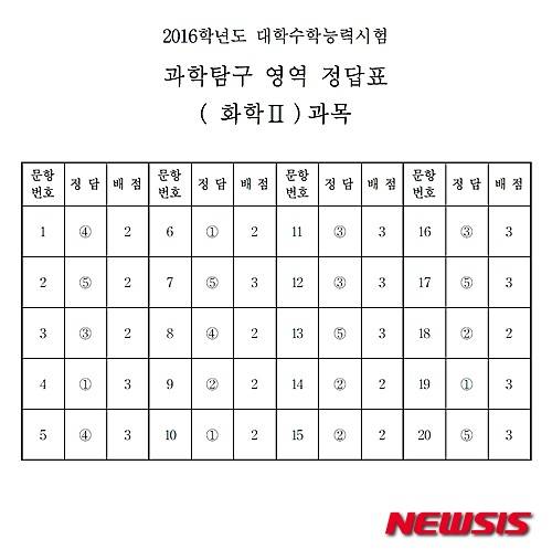 【서울=뉴시스】임종명 기자 = 2016학년도 대학수학능력시험 과학탐구영역 화학Ⅱ 답안. (답안 = 한국교육과정평가원 제공) 2015.11.12.