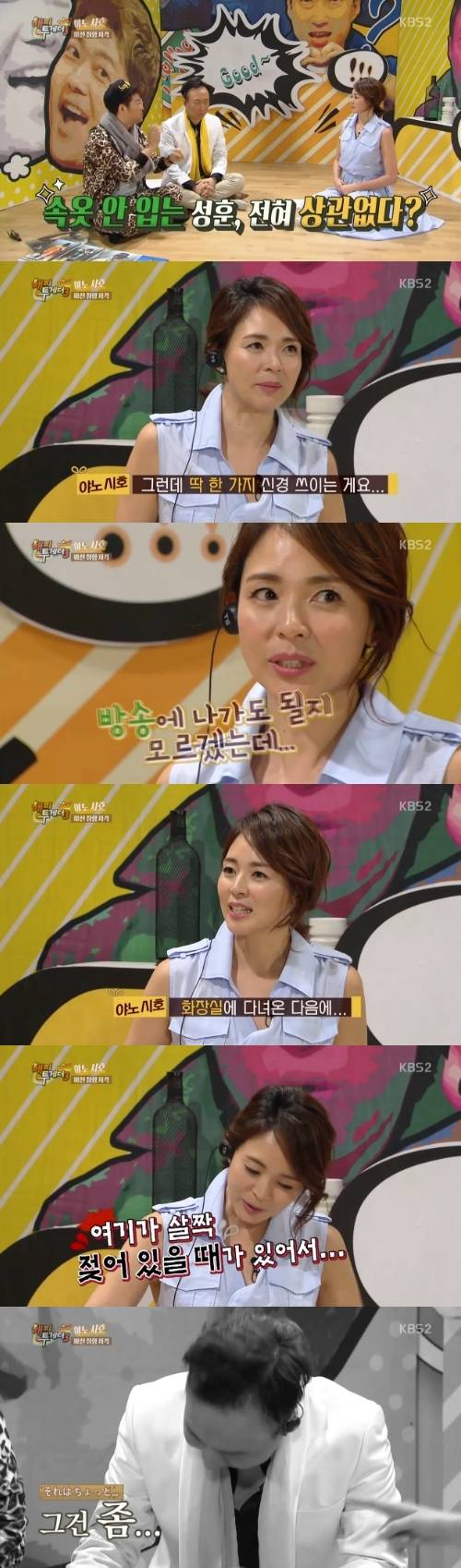 이후 야노시호는 “화장실에 다녀온 다음에 여기가 살짝 젖어 있을 때가 있어서”라며 바지가 젖어있을 때가 있다고 말해 박명수와 전현무를 폭소케 했다.