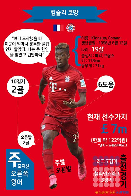 프랑스 파리에서 태어나 프랑스에서 자란 ‘파리지앵’ 코망은 2004년 8살에 나이로 자신의 고향을 친정으로 삼는 명문구단 파리생제르망(이하 PSG)에 입단했다. 그가 프로로 전격 데뷔하기 전 클럽도 바로 친정 팀 PSG다. 아직 열 아홉 살에 불과한 나이지만, 뮌헨으로 이적하면서 선수가치는 7백만 파운드(한화 약 122억원)로 껑충 뛰었고, 아무리 ‘세계최강’ 클럽 중 한 팀이라지만 그가 보여주고 있는 기록들은 절대 무시 할 수 없다. 챔피언스리그 포함 총 10경기에 나서 2득점 6도움을 기록하고 있는 코망은 이미 네 다섯 살 많은 선수들과 주전경쟁을 하기 시작했다.
