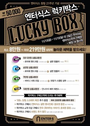 이벤트는 13일부터 15일까지 단 3일간 실시되며 럭키박스 참여 시 100% 당첨 스크래치 복권을 함께 증정한다. 이벤트 참여 비용은 5만원으로 엔터식스 전 점에서 참여 가능하다.