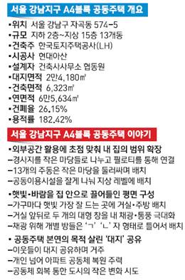 최근 선보이는 새 아파트의 특징은 내부 평면이 과거와 다르다는 점이다. 성냥갑 같은 획일적인 평면에서 벗어나 3베이·4베이·알파룸 등 다양한 신평면이 쏟아지고 있다. 이는 다분히 아파트에 거주하는 개인에 초점이 맞춰진 것이다. 하지만 공동주택인 아파트는 말 그대로 여러 사람이 한데 모여 사는 '공동'의 공간이다. 이런 점에서 '2015 한국건축문화대상'에서 공동주거 부문 대상을 받은 서울 강남지구 A4블록 공동주택(강남브리즈힐아파트)은 새로운 공동주택의 기준을 제시하는 건물이다. 핵심은 여러 사람이 모여 사는 공동주택의 장점을 극대화하기 위해 내부 평면보다 외부공간의 활용에 초점을 맞춘 것이다. 특히 이 공동주택은 대지를 공유하며 집합으로 거주한다는 것이 우리의 일상을 어떻게 변화시킬 수 있는가에 대해 묻고 있다.