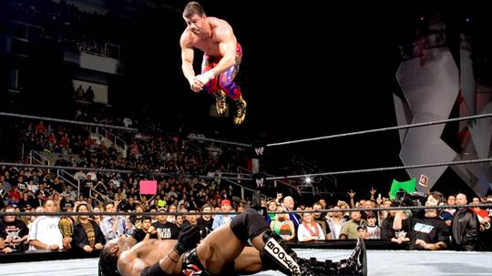 1995년 미국 관중 앞에서 처음 선보여 센세이션을 일으켰던, 에디 게레로를 대표하는 기술로, 공중에서 개구리가 도약하듯 몸을 움츠렸다 펴는 동작을 통해 일반 스플래시보다 더 큰 데미지를 주는 '프로그 스플래시'는 최근까지 세스 롤린스가 에디 게레로를 추모하는 의미로 사용해 팬들을 환호케 했다. 이렇듯 늘 최선을 다해 팬들을 위한 레슬링을 했던 진정한 프로레슬러 에디 게레로는 아직도 팬들의 가슴 속에 살아 있다. (사진=ⓒWWE.com)