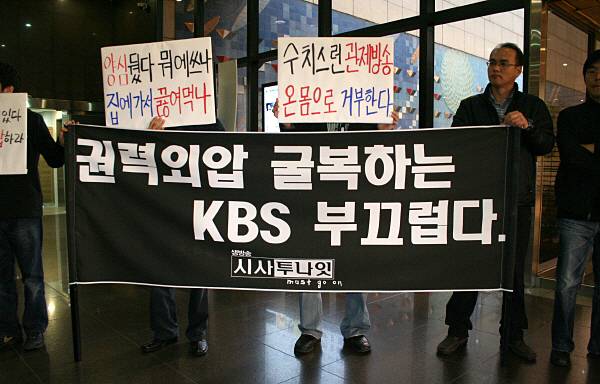 | ▲ 2008년 11월 KBS PD 30여명이 시사투나잇 페지에 반발하며 KBS 신관에서 시위를 하고 있다. KBS에서는 비슷한 시가 미디어포커스 등 프로그램이 변경, 폐지 됐다.