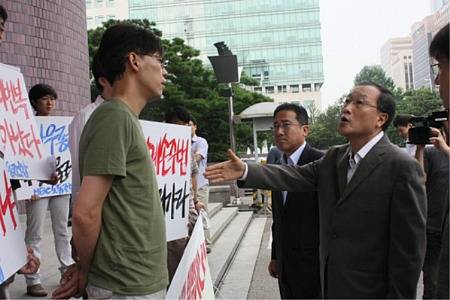 | ▲ 2011년 8월 서울 영등포구 여의도 MBC 사옥에서 출근길에 나선 김재철 사장(오른쪽)을 막아선 정영하 위원장(왼쪽)이 대화하고 있다. 사진=전국언론노동조합 MBC본부 | ||