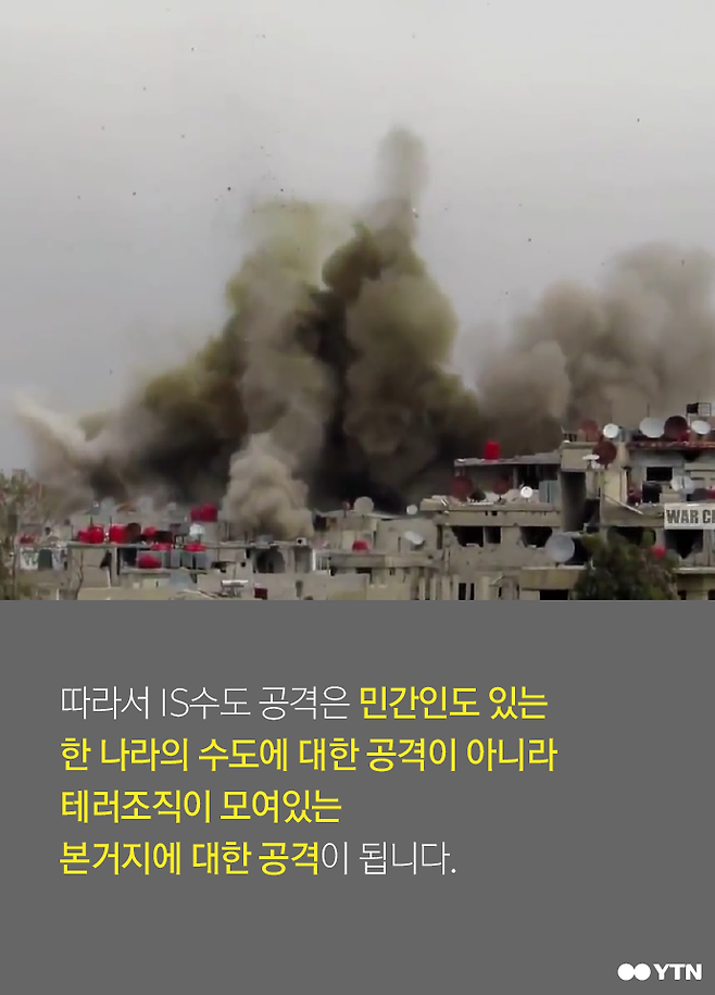 따라서 IS수도 공격은 민간인도 있는 한 나라의 수도에 대한 공격이 아니라 테러조직이 모여있는 본거지에 대한 공격이 됩니다.